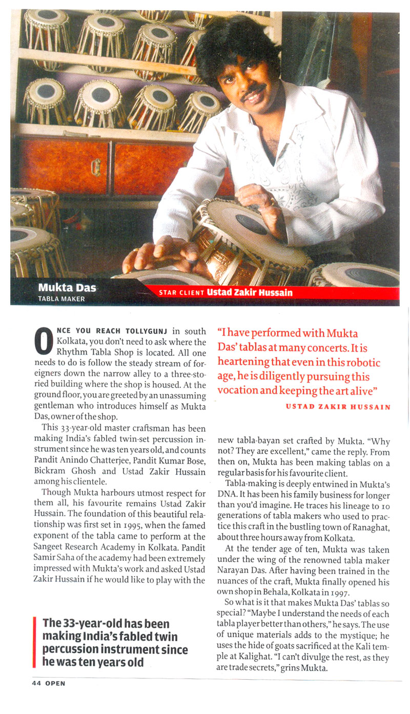 Mukta Das was born into a family lineage of 11 generations of tabla makers. His Father's Grandfather, the great master Surandrnhath Das had previously set the level. Mukta worked in his father's shop with his two elder and three younger brothers, as well his sister's children in their home village of Ranaghat Nadiya. In 1986 Mukta made a big decision and moved to Kolkata to begin Talim (training) under the great Tabla making Guru Nariyan Das. After fifteen years of dedicated work in Nariayan Das's tabla shop, Mukta began thinking that one day he could have his very own shop. In Behala Sholshoena, the Behala district of Kolkata "Rhythm" came to be Mukta's first shop. It was there that Mukta made some major strides in developing his quality. He also obtained a world wide export license in 1999. " Rhythm " then flourished. One Year later Mukta supplied The I.T.C Sangeet Research Academy with all new instruments and built a new and bigger shop in the Tollygunge area of south Kolkata. |